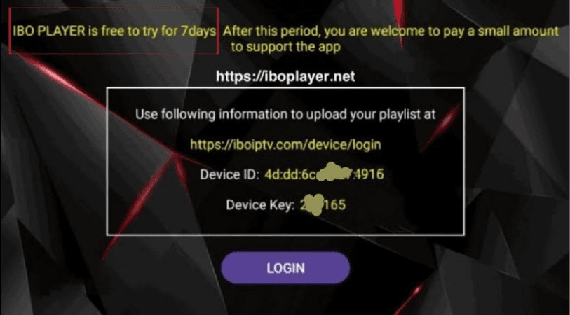 Step 2: Open the app once downloaded, and you will get Mac address details and a device key (as shown in the pic for example). Then you need to take a photo of it and send it to us to activate the app and upload your playlist (if you need help for that).